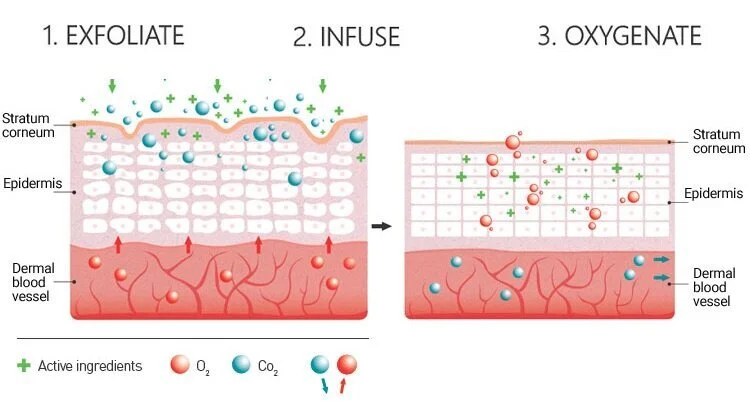 “A device attached to a machine streams oxygen, which pushes high concentrations of skincare ingredients (such as hyaluronic acid and/or retinal) into your skin. ”